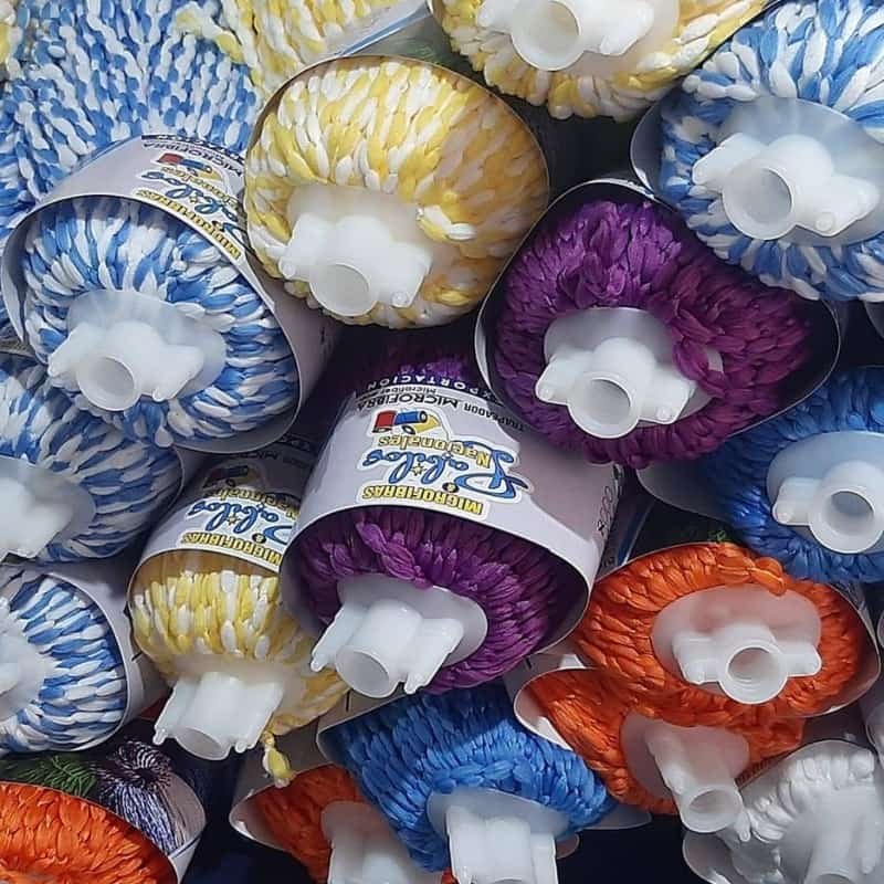 Nuestros pabilos de microfibra son a base de Poliéster/Poliamida de Alta Resistencia en vibrantes colores. Esta materia prima para trapeadores garantiza máxima absorción y durabilidad, optimizando la fabricación de trapeadores de calidad superior.